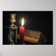 Libros de época y vidrio de color sobre fondo oscuro disparando velas rojas