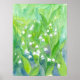 Poster florido de bonito con flores de Lily del Valle, con hojas pintadas en suaves tonos verdes que rodean las delicadas flores blancas y un fondo azul índigo pintado de acuarela. Un tranquilo poster floral para su casa u oficina.