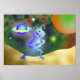 Un monstruo ajeno personalizado lindo de otro mundo que recorre el planeta arenoso. Ilustracion de un paisaje de fantasía de ciencia ficción diseñado para una impresión poster.