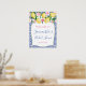 Limoneros acuarela con rosas rosadas y peonías contra un fondo de patrón de baldosa azul cobalto y blanco para este elegante cartel de bienvenida de Despedida de Soltera o Baby Shower.