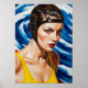 Un cuadro intensamente dramático de aceite Art Déco, este primer acercamiento extremo captura la determinación inquebrantable de una surfista, su impecable piel de marfil y el traje amarillo canario representado en negritas colores primarios contra una abstracta y agitada ola azul cobalto.