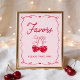 This sweetheart-themed favors sign features a soft pink background and a Valentine-inspired design for a baby shower favors table. “Favors” is shown in a handwritten red script, with red heart-shaped cherries tied with a bow displayed beneath the lettering. Guest instructions appear below, shown as “Please Take One.” A hand-drawn red ribbon frame accented with small heart details surrounds the layout, tying the sign into a sweetheart-themed baby shower décor style.