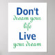 Este poster motivador, perfecto para el aula, tiene una cita motivacional en azul y verde: No sueñes con tu vida Vive tu sueño.