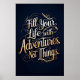 Inspire a usted y a otros con este impresionante poster de arte de pared motivacional con un elegante diseño tipográfico. Mostrando el enriquecedor mensaje "Rellene su vida con aventuras, no cosas", esta pieza combina un rico fondo azul marino con cálidas letras de tonos dorados y florecientes decorativos. Este arte mural motivacional es un regalo maravilloso para los que buscan aventuras, empresarios, soñadores y cualquiera que quiera ser inspirado para crear una vida extraordinaria. Muéstralo de manera prominente para impulsar la motivación, la productividad y una mentalidad positiva todos los días.