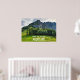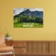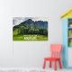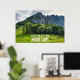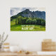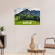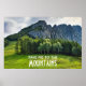 Este poster cuenta con una foto de una montaña en el norte de Italia con un bosque de pinos en un día de verano nublado. La leyenda dice "Llévame a las montañas".