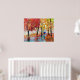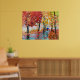 Una mujer con un paraguas azul camina por la lluvia de otoño en este cuadro. En esta escena se utilizaron rojos vibrantes y naranjas con pintura al óleo sobre lienzo.