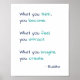"Lo que piensas, te conviertes. Lo que sientes, te atraes. Lo que imaginas, lo creas". Verdadera sabiduría de Gautam Buddha - una cita de la verdad de la vida sobre ti, una cita para ayudarte a entenderte y a entender mejor tu vida; una cita sobre tu realidad. Un gran poster para sus paredes, habitación, oficina, jardín, dormitorio. Hace un gran regalo para amigos y familia, para graduación, cumpleaños, navidades, vacaciones y más.