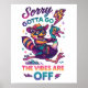 Diseño vibrante y colorido con un mapache personalizado vestido de gorra de vaquero tirando a un corredor de carreteras personalizado. El colorido texto dice: "Lo siento, tengo que salir las vibraciones están apagadas". Este diseño está disponible en una amplia variedad de productos.