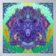 Un lobo majestuoso y alado ocupa el centro de la imagen, sus ojos penetrantes y su expresión decidida que transmite un sentido de poder y nobleza. Alrededor del lobo hay patrones intrincados y ornamentales, que incluyen ángeles, cráneos, llamas y un cartel con un símbolo.