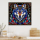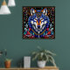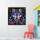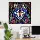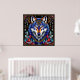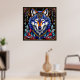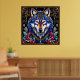 Cabeza de lobo de estilo asombroso, caracterizada por patrones intrincados y colores vibrantes. La piel del lobo es predominantemente una mezcla de azul y blanco, con acentos naranjas brillantes que resaltan la cara y las orejas. Alrededor de su cuello, una cadena decorativa aporta un toque ornamental. El fondo está adornado con varias formas coloridas, como cristales y hojas, que realzan el ambiente místico y artístico de la obra. Además, elementos decorativos como abalorios y adornos se deslizan por los lados, lo que contribuye a crear un ambiente bohemio.