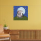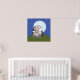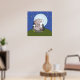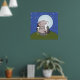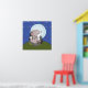 Un adorable lobo bebé sentado en unas rocas gritando en una gran luna azul llena.