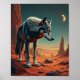 Lobo solitario en el desierto del espacio de Marte - Un lobo solitario sobre un paisaje desierto rojo, su piel es una mezcla de gris y blanco, con un toque de marrón. Los ojos del lobo son de un amarillo penetrante, y miran atentamente hacia la perspectiva. El fondo de la playa es un desierto interminable y escarpado, con grandes y delgadas formaciones rocosas que emergen de la arena. Una luna semicírculo cuelga del cielo azul oscuro, salpicado de estrellas.