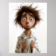 Un ilustracion caprichoso y relacionable de un hombre desgreñado en un albornoz que aferra una taza de café con ojos anchos y cansados. Su desordenado cabello y su desconcertada expresión capturan perfectamente el caos de las primeras mañanas antes de que surta efecto la cafeína.