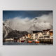 El bonito pueblo de pescadores Henningsvaer, situado en la costa de Lofoten, al norte de Noruega, Escandinavia. Esta foto fue tomada en abril, con la nieve del invierno todavía en la cima de las montañas en el fondo. Algunos barcos de pesca están amarrados en el muelle.