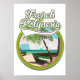 Logo de viaje retro de la Polinesia Francesa de un barco de pesca en una playa.