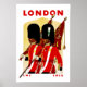 Poster de viajes vintage para Londres mostrando a los Guardias Reales paseando los colores.