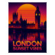 Diseño de afiches de viajes retro titulado "London Sunset Vibes", que presenta el horizonte de Londres a la hora dorada al estilo poster de los años 80. Las Casas del Parlamento y el Big Ben están de pie, sus siluetas brillan contra un vibrante cielo degradado de naranja profundo, magenta y morado