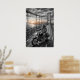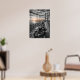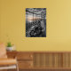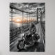 Póster Lone Biker Crosses Suspension Bridge City Skyline