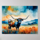A majestic longhorn steer in a whimsical, abstract art style, blending complementary colors with fine details reminiscent of Arthur Rackham's and Paul Klee's signature techniques.