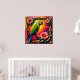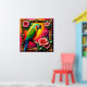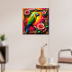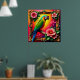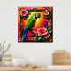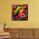 Loro colorido con un plumaje vívido se sienta en una rama, acompañado de flores tropicales brillantes en un ambiente tranquilo de color azul, creando una vibrante y animada temática tropical.