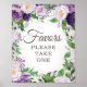Pequeña ducha de bebé "Favors Please Take One" poster con peonías acuarelas elegantes/florales en tonos morado, hojas verdes y follaje.