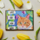 Arte folclórico capilar acuarela naranja gato y flores azules y moradas. Cita, "Los gatos son mi tribu", contenido generativo.