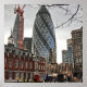El icónico rascacielos moderno con un diseño geométrico único se destaca prominentemente contra un telón de fondo de un cielo vibrante, mientras que los edificios históricos y una escultura caprichosa son visibles en primer plano. La escena contrasta la arquitectura contemporánea con las estructuras clásicas de Londres. ¡En primer plano notarás los otros pepinillos de Londres!