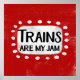 "Los trenes son mi mermelada" es un divertido diseño de texto con una forma de acento blanco rodeado de puntos de textura caprichosos.