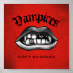 Poster de vampiros con el gracioso texto de Vampires Don't Do Dishes y una obra de arte original de una boca de vampiros con colmillos y dientes rotos, criaturas malignas acechando en el oscuro y rojo fondo texturado. Gran diseño para Halloween y para los fans del estilo gótico con sentido del humor.