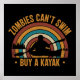 Impresionantes camisetas de diseño de kayak, posters, bolsas, planificadores, y más con una silueta en kayak en un río, árboles y texto que dice Zombies no pueden nadar ¡Compra un Kayak! Camisetas divertidas de diseño de kayaker y más hacen grandes regalos para el ávido kayaker!