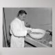 Vacuna antineumonía por el ejército. Washington, D.C., 1 de setiembre. El Centro Médico del Ejército está preparando una vacuna contra la neumonía para la primera inoculación masiva jamás intentada en la batalla contra la enfermedad. Los voluntarios del CCC serán los cobayas humanos en el experimento. La vacuna, que es 10 veces más costosa que el oro, se está haciendo para su distribución este otoño a todos los inscriptos en la CCC que desean inoculaciones, los oficiales esperan tener suficiente vacuna para salvaguardar a 300.000 individuos. Se muestra al capitán John R. Wood, del Centro Médico del Ejército disolviendo los principios activos en ácido clorhídrico fuerte en el primer paso de la fabricación. Fotografía tomada el 1 de setiembre de 1937.