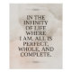 Transforme su espacio con este impresionante poster que presenta la cita edificante de Louise Hay: 'En el infinito de la vida donde estoy, todo es perfecto, completo y completo'. Esta elegante pieza de arte mural está diseñada para dar un sentido de paz, armonía y equilibrio a tu entorno. Con su mensaje tranquilizador, este poster fomenta la atención, la gratitud y la autoaceptación, lo que lo hace perfecto para salas de meditación, habitaciones o espacios de vida. Imprimido sobre papel de primera calidad, se integra perfectamente en cualquier decoración moderna, a la vez que inspira positividad y fuerza interior.
