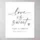 Sweeten your celebration with this modern black and white Love Is Sweet wedding sign, perfect for your dessert table or candy buffet. Designed with minimalist handwritten typography and a delicate heart detail, this simple tabletop sign adds a stylish, contemporary touch to your décor. Ideal for modern weddings, it beautifully complements any theme while inviting guests to indulge and enjoy the treats you’ve prepared.