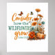 Diseño pacífico y colorido con una hermosa escena otoño/otoño con calabaza, mariposas y flores caídas. El colorido texto inspirador dice: "Consideren cómo crecen las flores silvestres. Lucas 12:27". Este diseño está disponible en una amplia variedad de productos.