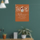Bienvenidos a nuestra boda rústica y elegante. Este cartel encantador presenta un fondo naranja quemado con un toque bohemio, acentuado por un esquema de colores burgundy y melocotón. El centro de mesa es un frasco de mason floral que muestra las iniciales de la pareja en caligrafía moderna y elegante. Las luces de cadenas añaden un resplandor cálido y acogedor, estableciendo el tono perfecto para nuestro día especial.