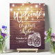 Plantillas de Letrero de Bienvenida para Recepción de Boda - Elegante Pareja Frascos de Mason y Luces de Cuerda en Fondo de Madera Rústica.
