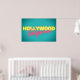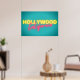 Diseño tipográfico de apariencia vintage con "Hollywood, California" en texto de neón dorado y rosa sobre fondo de agua envejecido / retro