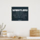 Un poster de lucha libre motivacional, de tela de denim azul rasgada y rota, con hilo suelto blanco y letras cruzadas. Diseño poster y cita de lucha libre de Felicity Luckey de Great Minds Think Fit™.