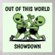 Este poster presenta a dos extraterrestres encerrados en un partido de lucha libre, Los extraterrestres están a medio camino, mostrando fuerza y agilidad mientras luchan por la victoria. Encima de ellos, el texto dice "Fuera de este mundo, abajo", enfatizando la emocionante batalla que está ocurriendo.