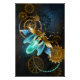 luciérnagas de vapor con alas transparentes azules y bombilla verde sobre fondo gastado, marrón y texturado. Estilo Steampunk.
