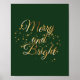 Fondo verde oscuro del bosque con "Merry and Bright" en letras de Relieve metalizado dorado