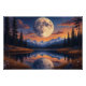 Una luna gigante domina el cielo nocturno, iluminando montañas con cumbres nevadas y reflejándose en un lago tranquilo. Árboles altos enmarcan las orillas, mientras que nubes naranjas y azules pintan el horizonte. Las estrellas brillan alrededor, creando una escena mágica que transmite paz y asombro. Perfecta para evocar sueños y conexiones con la naturaleza salvaje, esta obra de arte combina la belleza celestial y la tranquilidad terrenal en un solo momento.