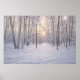 Un bosque invernal pacífico iluminado por cálida luz solar dorada que se filtra a través de abedules cubiertos de nieve. Este paisaje inspirado en Escandinavia captura la belleza tranquila de una mañana invernal nórdica, con nieve suave, luz delicada y una atmósfera serena. Arte para el hogar perfecto para llevar calidez, calma y elegancia natural a tu hogar, cabaña o interior moderno minimalista.