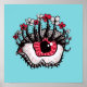 Poster de ojos raros con un ilustracion digital que representa un ojo rojo espeluznante con pestañas que tienen sus propios pestañas y terminan en flores rojas y grises sobre un alegre fondo azul. Cuando a veces tus ojos están tan tensos que estás seguro de que se derretirán en los próximos tres segundos. Este diseño psicodélico es sólo para ti si te gustan los colores brillantes y el arte extraño.