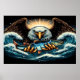 Un águila poderosa sostiene con gracia un pez brillante en sus agudos talones contra un cielo azul claro, mostrando sus impresionantes habilidades de caza.