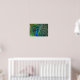 Impresión con un magnífico pavo real con su pico abierto y sus plumas de cola abiertas, mostrando sus hermosas plumas de color verde, azul y bronce. Bonita decoración mural para los amantes de las aves y la naturaleza. Foto tomada en Arcadia, California.