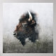 A striking image of a bison head emerging from a textured background. The contrast between the dark fur and light surroundings creates a dramatic effect.