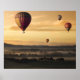 Majestic scene of hot air balloons floating in a sunset sky over a misty landscape.