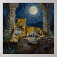 Leopard themed poster. On the front is an illustration of a majestic leopard with fur like molten gold, laying on a cliff ledge bathed in ethereal moonlight. Intricate carvings adorn crumbling stone pillars, and bioluminescent flora casts a soft, otherworldly glow. The scene is rendered in a rich, textural oil painting style with thick strokes.