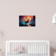 Una obra de arte de vida silvestre, con colores surrealistas vívidos, de un alce (o alce, o híbrido) de pie majestuosamente en perfil de 3/4 sobre un cultivo de rocas que se extiende por la cala al fondo de un pequeño cañón de niebla. Su cabeza está sostenida, y detrás de él hay un incendio que se acerca rápidamente.